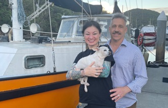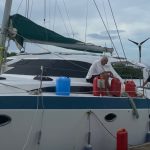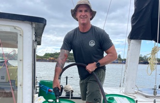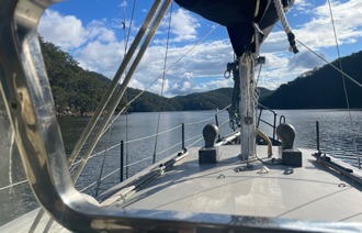 There was a lot of communication back and forth prior to commencement of this delivery. Bankura was imported from USA on a float on float off ship. As such there was not exact time of arrival and on arrival of course customs and border force requirements. Unfortunately when Rivergate lifted her out, the surveyor discovered a section of the hull was corroded down to 1mm from the original 4mm subsequently that section had to be cut out replaced, faired and painted. Of course, internally, furniture had to be removed and duly replaced. All this took time patience and unfortunately for owners Jackie and Peter extra cash. Eventually the day came and new crewman Adam filled in for Murray who was off doing family duties. Now whilst all that delay was happening, a war in the Middle East started and obtaining fuel was uncertain. our half way point and my homie town Coffs Harbour were only supplying their own fishing fleet. So the search was on for jerry's or drums. Bunnings and the other adventure stores had all sold out but Adam searched Marketplace who had multiple suppliers of different sized drums. We picked up 3 x 60lt drums which was more than adequate. With very little wind, we only got all the sails up once for about a 6 hour window and one over 12 kts of wind we were able to utilise the Aquavane wind pilot. Adam did incredible well and took to our crazy delivery methods admirably and I thank him for all his help and lok forward to having him onboard again. With little incidence and a lot of southerly current we made great time to Pittwater and managed to arrive in time to navigate up to the beautiful D'Albora Akuna Bay Marina and met Jackie and Pete on person for the first time. They along with their 6 fur-kids will spend a lot of time on their beloved Bankura and We wish them well in their new home port.